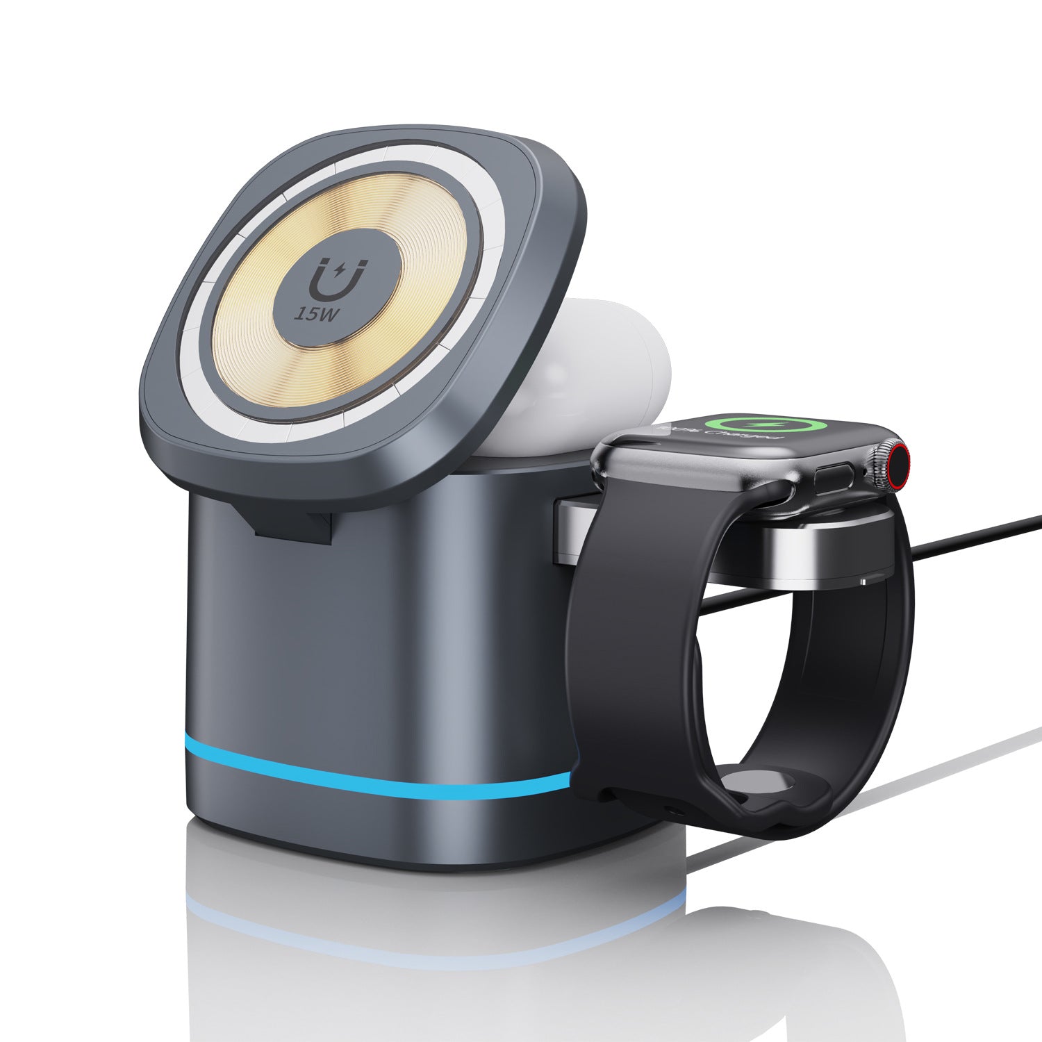 - Fast Magnetic Charging: The 3 in 1 charging station is equipped with strong magnets, the charger instantly aligns and securely attaches to your devices for efficient wireless charging. For optimal performance, center your phone or watch on the charging area and remove any case thicker than 5mm (magnetic cases are compatible).